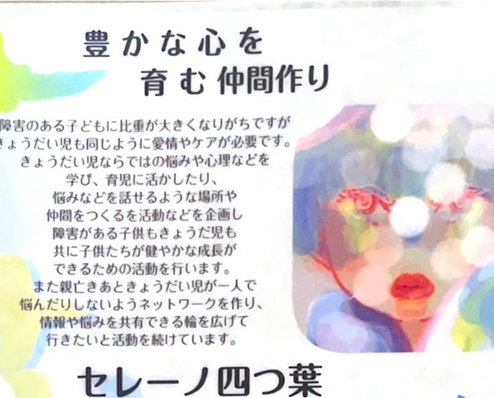 障害のある子どもに比重が大きくなりがちですがきょうだい児も同じように愛情が必要です。きょうだい児ならではの心理などを勉強したりきょうだい児同士がつながり悩みなどを話せるような場所や仲間をつくるを活動などを企画し共に子供たちが健やかな成長につながるの活動を行います。