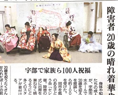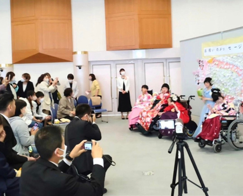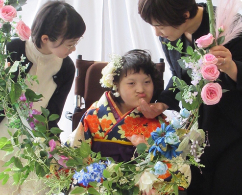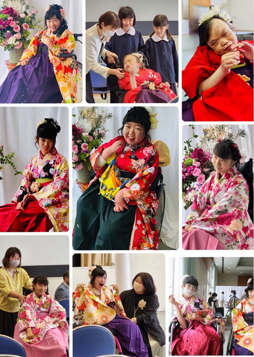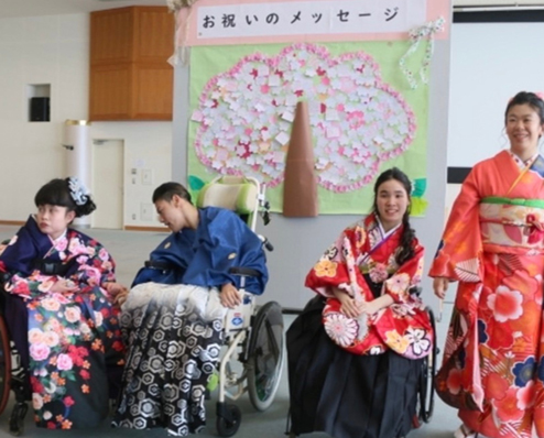 障がいの特性により地域の成人式に出にくい、着物を着てお祝いするのは難しいと思われているご家族の為に着物を車いすでも着やすいよう補正したり着付けの練習をし、晴れ着を着たお子さまのご成長をご家族や仲間、支援して下さった方々と一緒にお祝いし、喜びえる式典を企画・実施しています。